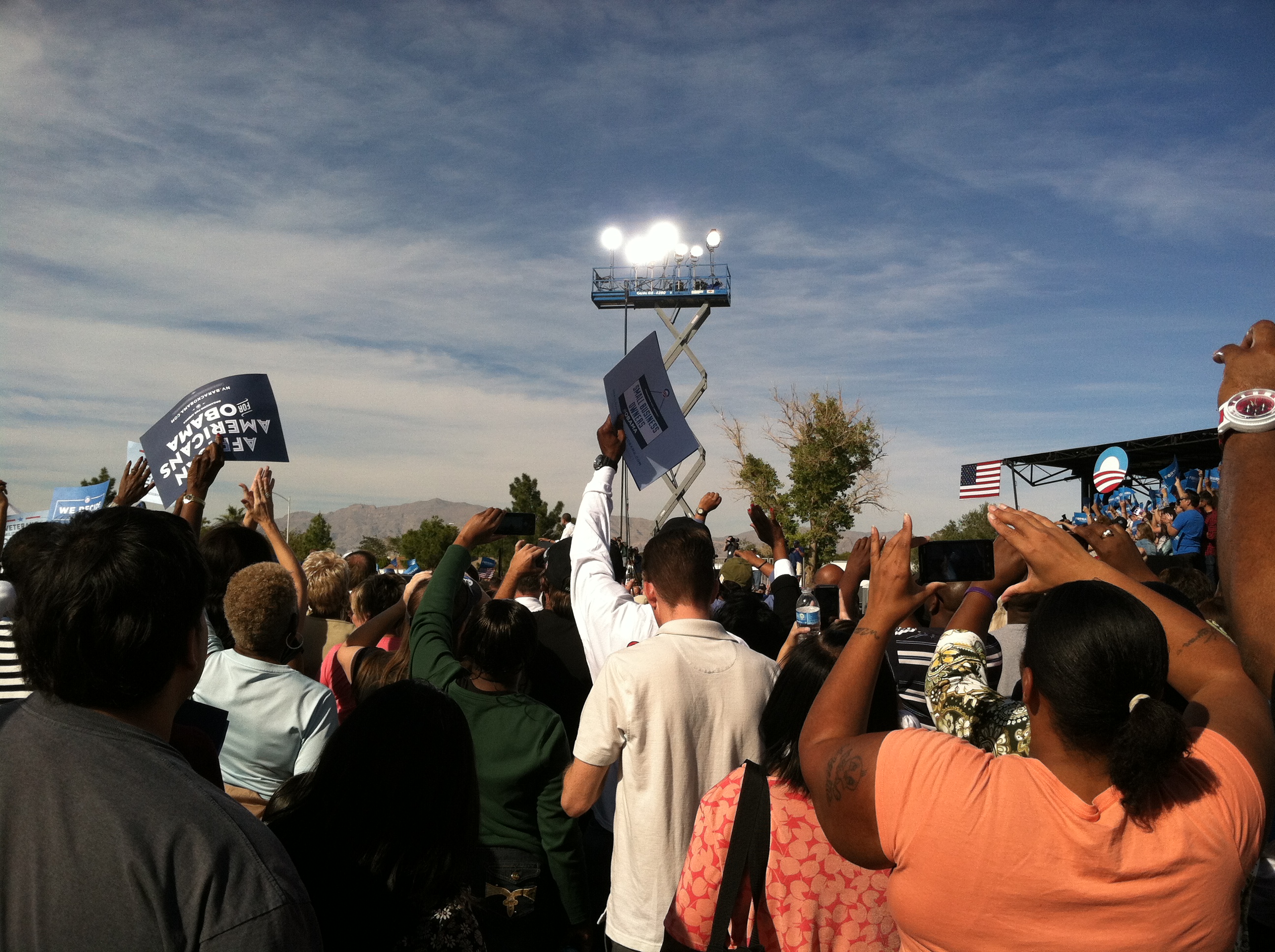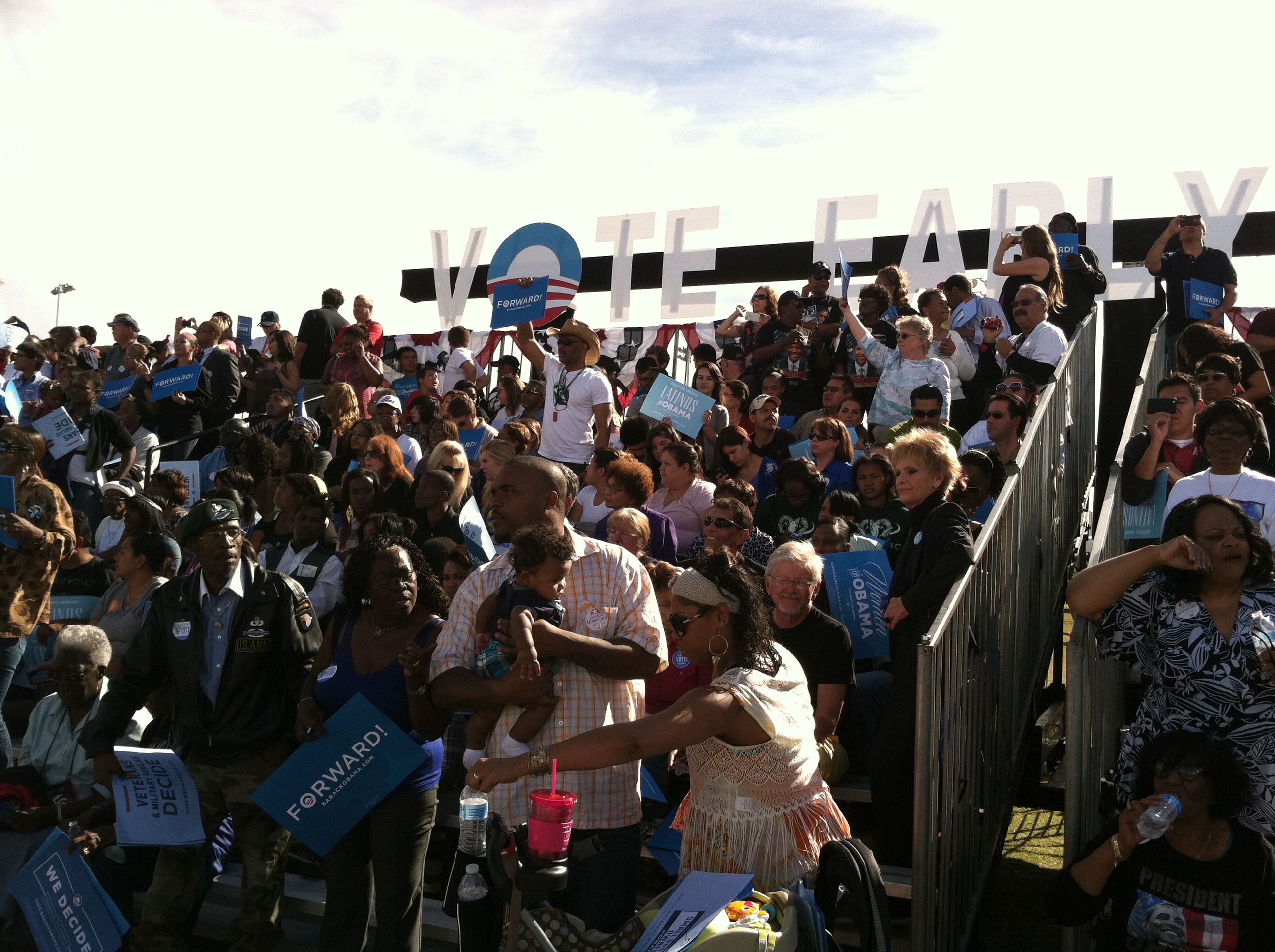 Before presenting his stump speech, Barack Obama emerged on to the stage to an enthusiastic chanting crowd, the majority excited about hosting the President in their community.