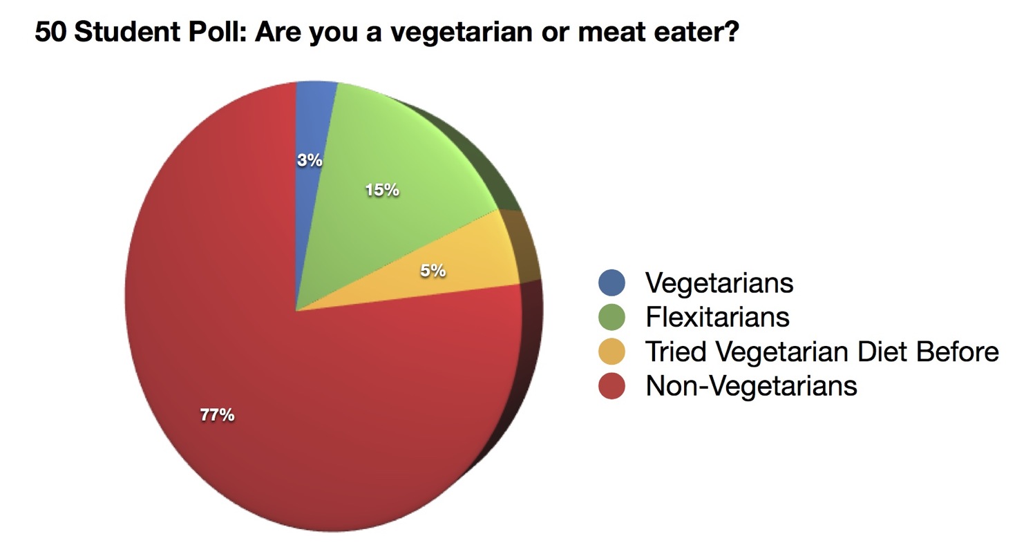 According to a recent poll of 50 CSN students, two out of the 50 students are vegetarians. Nine of the 48 carnivore students are flexitarians, who eat meat on occasion. Three of the 48 students have tried to be vegetarians in the past.