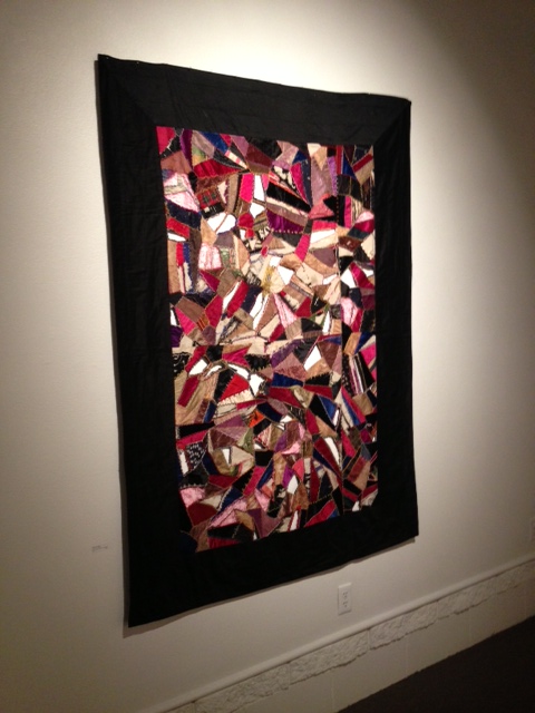 Another series of artwork accompanies the portraits in the exhibition. Focusing on the female identity and the evolution of the female role, these pieces include the aforementioned quilt constructed out of women’s thong underwear and a set of boxes that contain embroideries of familiar nursery rhymes juxtaposed against statements of feministic text.