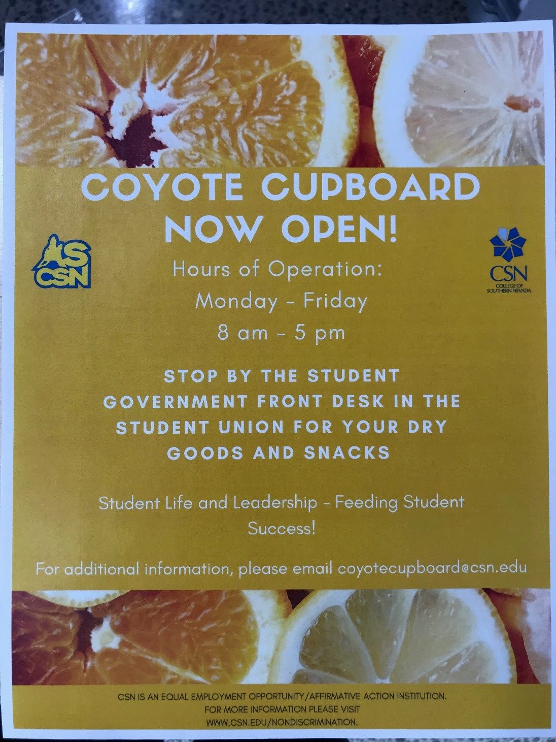 “The Coyote Cupboards are an outcome of CSN’s commitment to placing students first,” says Akins, in that press release. “This grant will help us lower the number of CSN students who experience food insecurity, which is far too high.”